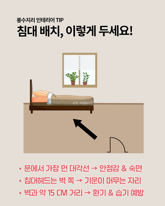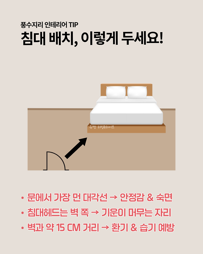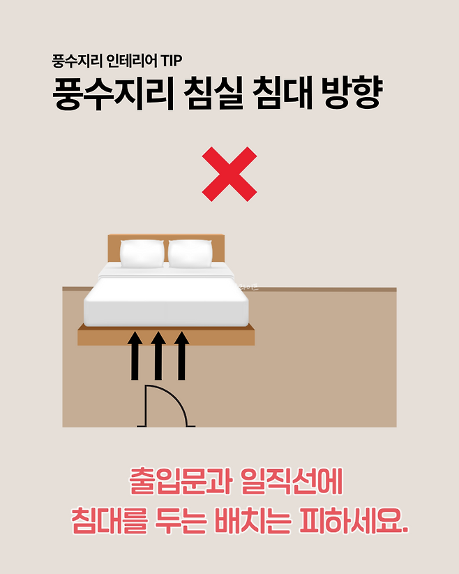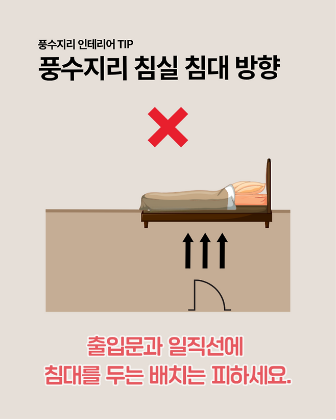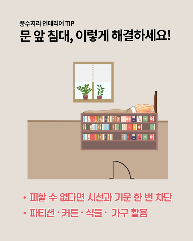 문은 기운이 드나드는 통로이기 때문에 침대가 문과 일직선상에 놓이면 수면 중에도 미세한 긴장감을 느끼기 쉽습니다.