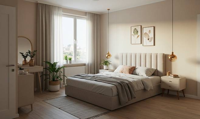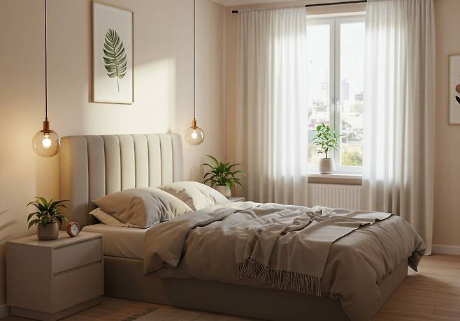 이런 요소들은 침실의 결을 더 부드럽게 만들고 편안함의 층을 하나 더 쌓아줍니다.