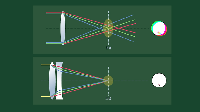 단일렌즈를 쓰면 빛의 초점이 색에 따라 다른 위치에 맺히지만, 오목렌즈와 볼록렌즈를 적절히 겹쳐주면 한점에 맺히게 할 수 있는 방법을 이용한 겁니다.