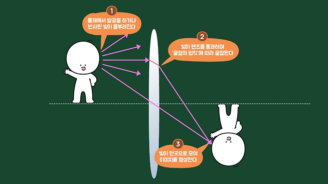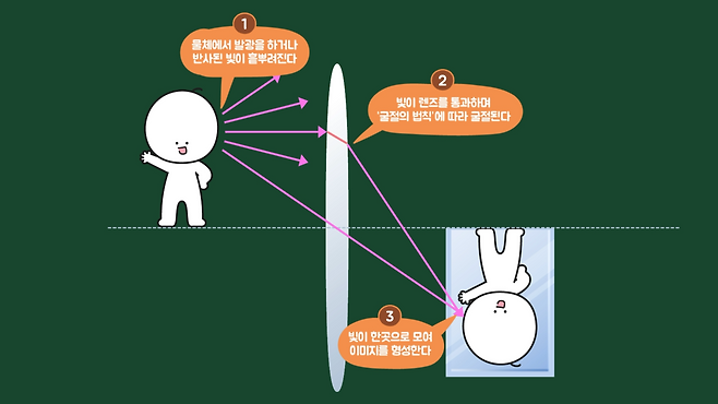 잘 설계된 렌즈는 빛을 한곳으로 모아줄 수 있고, 모인 빛은 이미지를 형성하며, 해당 지점에 스크린을 두어서 빛을 다시 흩뿌린 뒤 파악하면 처음 그 물체가 상이 되어 확대되거나 축소된 형태로 나타나게 됩니다.