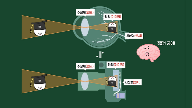 이때 스크린 대신 빛의 종류를 감지하는 센서를 넣으면 상의 모양을 인식할 수 있는 센서가 됩니다. 예를 들어 사람의 눈에서 수정체를 통해 빛을 모으고 망막에 이미징을 맺게 하면 시신경이 센서처럼 빛의 종류를 파악해 이미지를 모양으로 파악하는 것처럼 말입니다.