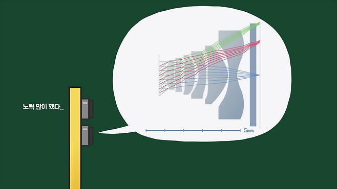 여러 겹의 렌즈를 겹쳤기에 스마트폰 카메라의 렌즈는 튀어나올 수밖에 없고, 이것도 최대한 슬림하게 하려고 컴퓨터 기술을 이용해 렌즈 설계를 최적화하여 만든 겁니다.