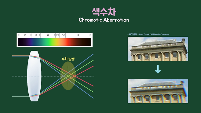렌즈가 초점을 맺을 때 한점에 맺히지 않아서 생기는 현상을 수차(Aberration)라고 합니다. 그중에서 빛의 색, 그러니까 빛의 파장 차이에 의해 발생되는 수차를 색수차(Chromatic Aberration)라고 합니다.