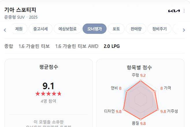 실제 차주들의 평가를 기반으로 차량 만족도 점수를 공개하는 ‘네이버 마이카 오너평가’에 따르면 기아 스포티지 2.0 LPG 모델의 오너평가 점수는 9.1점이다.