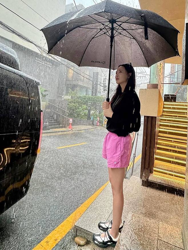 쏟아지는 빗줄기 아래, 우산 하나 들고 선 이주연. 비에 젖은 길마저도 화보처럼 만들어버리는 그녀의 존재감에 누리꾼들이 감탄 중이다. 블랙 맨투맨에 핑크 쇼츠, 그리고 스포티한 샌들로 마무리한 이 레인룩은 실용성과 러블리함을 모두 잡았다.