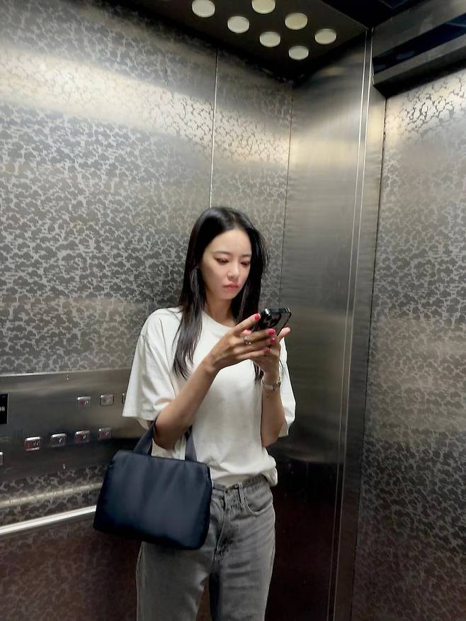 엘리베이터 셀카에서도 그녀의 ‘꾸안꾸 장인’ 면모가 드러난다. 오버핏 화이트 티셔츠와 그레이 데님, 그리고 블랙 토트백으로 무심한 듯 시크하게 마무리한 룩이 현실적인 데일리 코디로 제격이다.