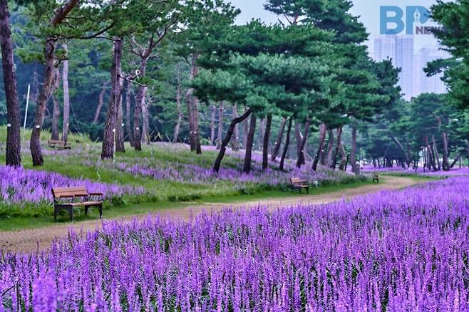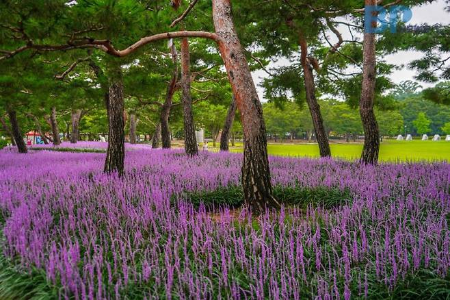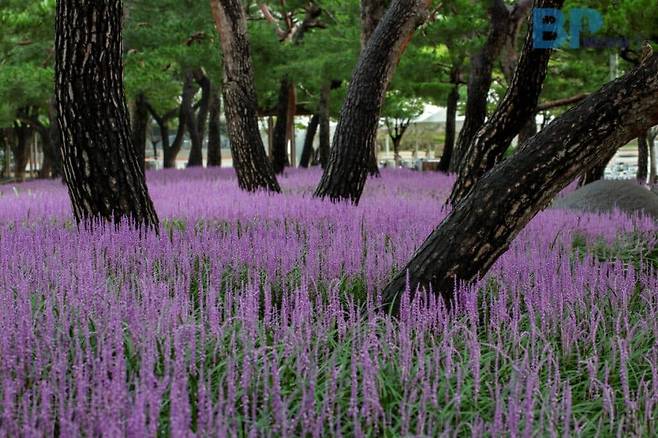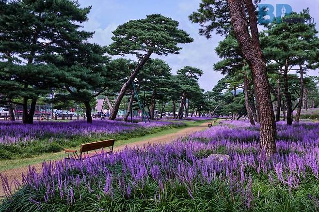 푸른 소나무와 벤치, 보랏빛으로 서정적인 물결을 이루는 맥문동 군락지는 마치 풍경화처럼 서정적인 한여름의 풍경을 완성한다.