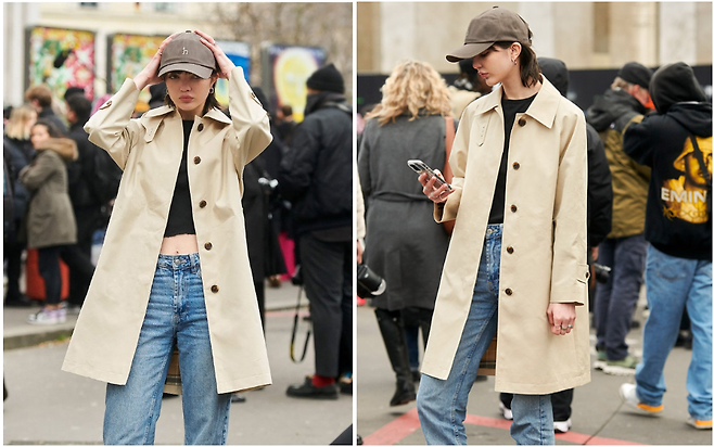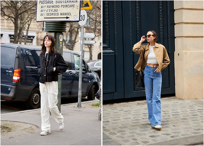 살짝 크롭된 데님 팬츠와 스니커즈,