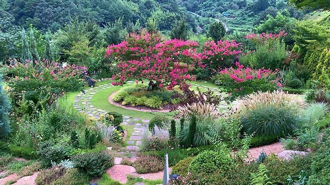 특히 여름철이면 이 정원은 본격적으로 활기를 띠는데, 배롱나무가 중심 공간에서 곡선의 수형을 자랑하고, 수국은 색상과 품종별로 공간을 분리해 정원 내에서 또 하나의 정원을 완성한다.