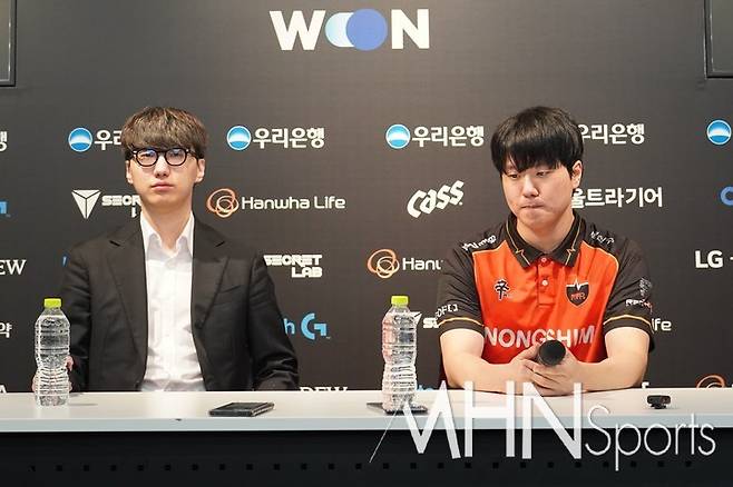 이날 경기 후 패자 인터뷰에는 농심 레드포스의 첼리 박승진 감독, 서포터 구거 김도엽 선수가 자리했다.
