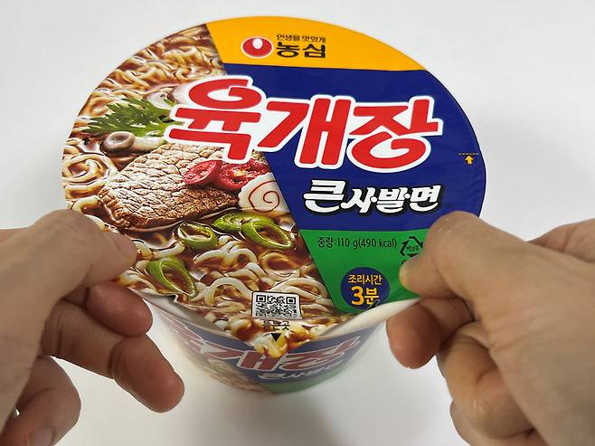 컵라면 뚜껑 양쪽을 손으로 살짝 밀어 넣으면 뚜껑이 들리지 않고 고정됩니다.