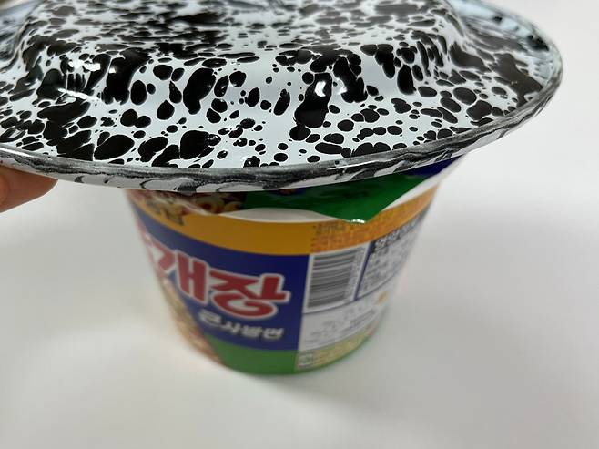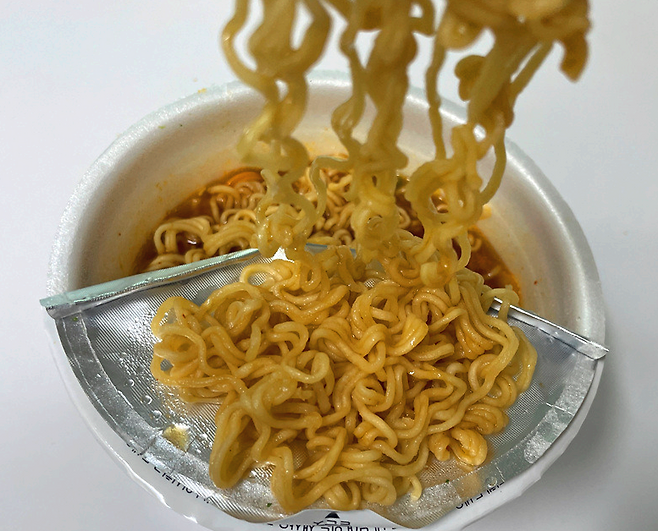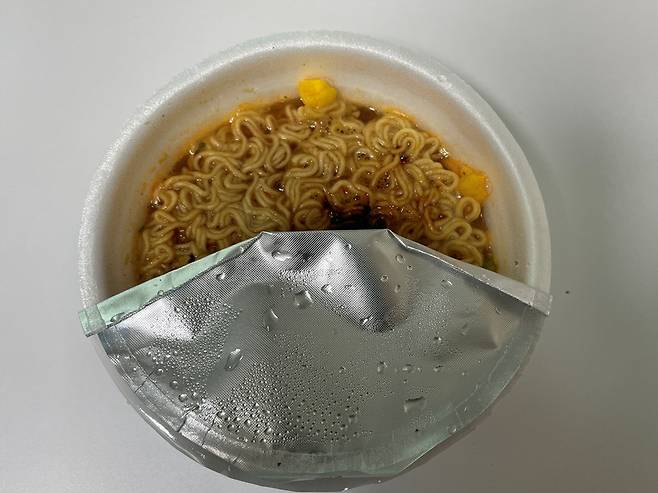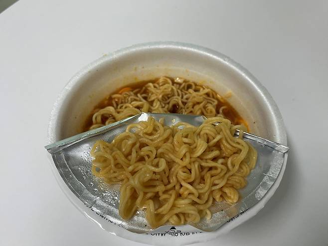 이제 컵라면을 반대로 돌리면, 뜨거운 라면을 올려 두고 식혀 먹기 딱 좋은 앞접시가 됩니다. 라면 한 젓가락 올려두고 식혀서 먹기 딱입니다.