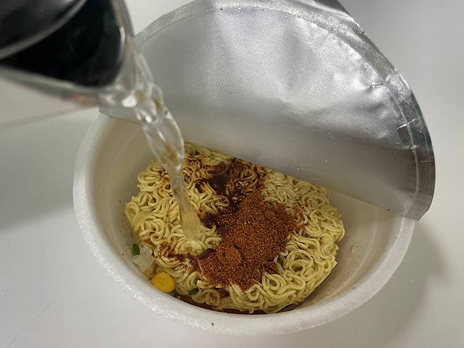 컵라면은 평소대로 수프를 넣은 후 물을 부어 익혀주세요. 뚜껑은 조리법 설명에 나오는 것처럼 표시선까지만 뜯으세요.