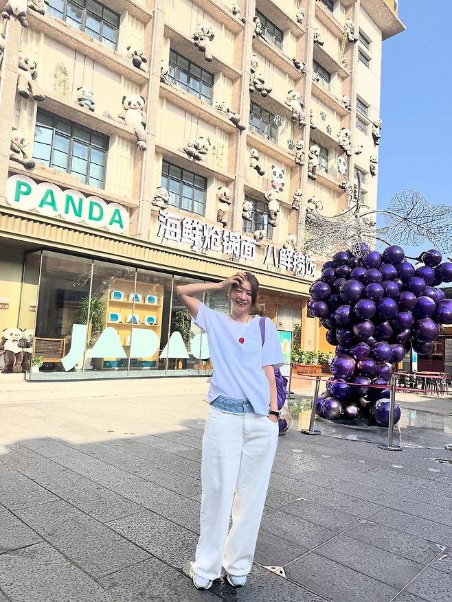 유인영이 판다 인형이 가득한 건물과 화려한 포도 조형물을 배경으로, 보기만 해도 기분이 좋아지는 해맑은 근황을 전했어요.