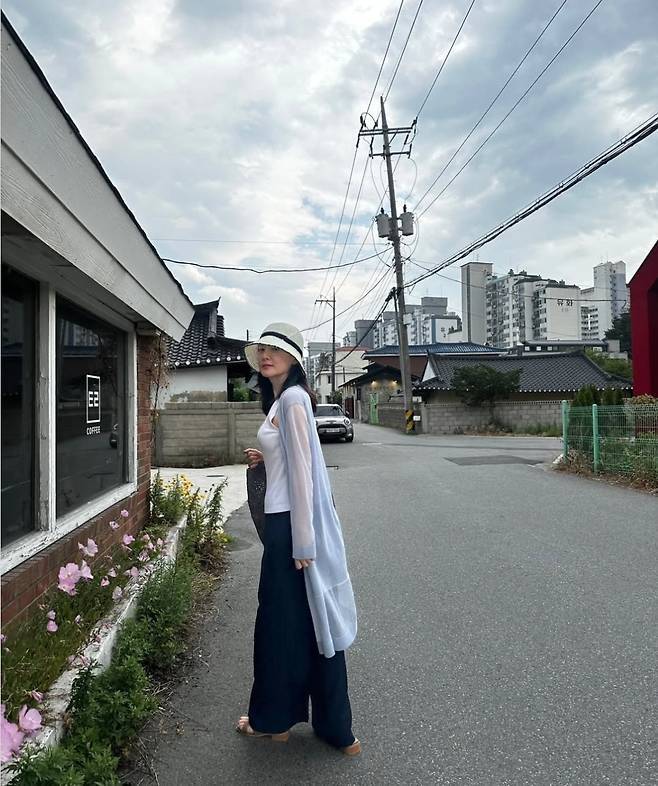 이영애는 해변에서 머리부터 발끝까지 내추럴한 톤온톤 스타일을 선보였으며, 얇고 비치는 긴 카디건과 함께 밀짚모자를 매치해 바람에 흩날리는 실루엣을 완성했습니다.