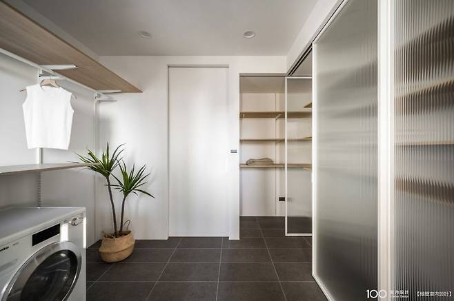모루 유리 슬라이딩 도어가 포인트! 빛은 통과시키면서 세탁 공간을 적당히 가려주어 집 전체 인테리어와 자연스럽게 어우러집니다.