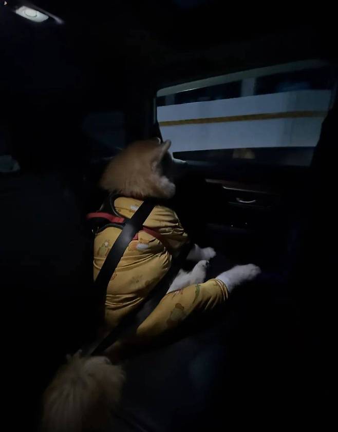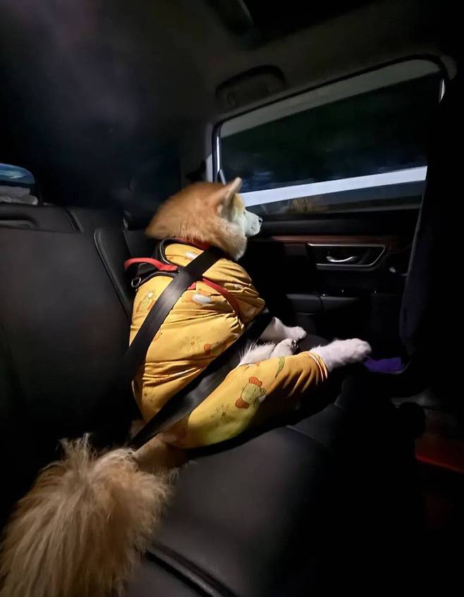 주인이 공개한 사진 속 모습은 보는 사람의 마음을 따듯하게 만듭니다. 외출을 위해 예쁜 옷을 차려입은 강아지는, 얌전히 뒷좌석에 앉아 안전벨트까지 착용한 모습입니다.