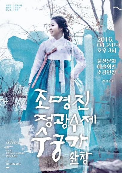 [이데일리 이윤정 기자] 국악인 조명진(43) 씨가 오는 4월 24일 오후 3시 울산문화예술회관 소공연장에서 ‘정광수제 수궁가’ 완창을 선보인다. 전남 진도 출신인 조씨는 현재 국악 불모지에 가까운 울산에서 ‘조명진 판소리 연구소’를 운영하며 국악 알리기에 앞장서고 있다.