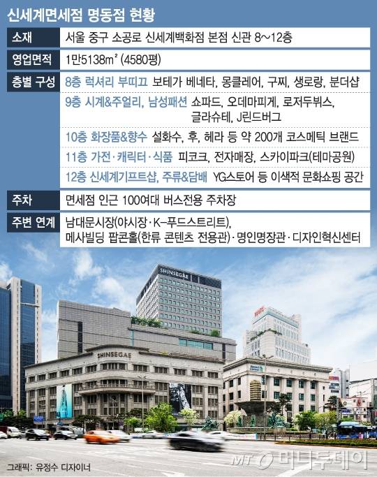 ◇"3대 해외명품 내년 입점"=신세계백화점 본점 8~12층에 영업면적 1만5138m²(약 4580평) 규모로 자리한 명동점은 외국인 관광객들이 '반드시 방문해야 하는 명소'(Must Visit Place)를 표방했다.