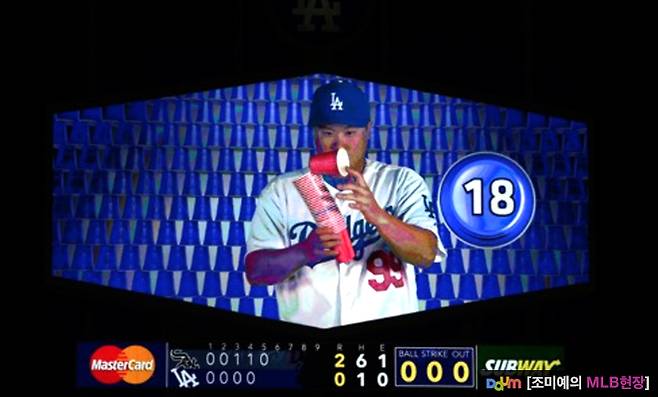 전광판에선 관중들의 모습을 비추는 형태로 진행되는데, 재미있는 컴퓨터 그래픽이 활용돼 재미를 더해줍니다.