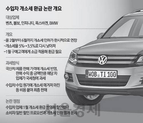 저희 벤츠 고객들은 개소세 환급과 관련해 아무런 불만도 제기하지 않고 있습니다.“ 개별소비세 인하분 환급 여부를 묻자 메르세데스벤츠 관계자가 내놓은 답변이다. 실제 벤츠를 산 사람들은 가만히 있는데 엉뚱한 사람들이 논란을 제기하고 있다는 말로 들린다. 하지만 지난 24일 일부 수입차 업체가 개소세 환급을 거부하기로 결정했다는 서울경제신문 보도 이후 일부 소비자들은 불매운동까지 벌이겠다는 격한 반응을 보이고 있다. 해당 업체 차량을 구입한 고객들도 불만을 토로하고 있다. 수입차 업체들의 도를 넘은 배짱영업을 지적한 셈이다. 벤츠·볼보·인피니티·폭스바겐·BMW 등 총 5개 수입차 업체가 지난 1월 구매자들에게 개소세 인하분을 환급하지 않겠다는 입장을 밝히면서 논란이 일파만파로 퍼지고 있다. 한달 만에 개소세 인하 카드를 다시 꺼낸 정부가 엉성한 정책을 내놓았다는 비판의 목소리도 높아지고 있다. 과연 ‘개소세 환급’ 논란의 이유는 무엇이며 누구의 잘못일까. Q&A로 알아본다.