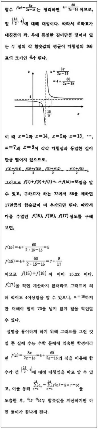 가장 고난도로 출제된 30번 문항의 경우 많은 학생들이 수열의 합을 이용해 문제를 해결하려다 낭패를 봤다. 문제의 조건인 f(x)의 특징을 면밀히 관찰하지 않고, 문제에서 제시된 식을 곧이곧대로 정리하려다 규칙을 더 이상 파악하지 못한 것이다. 그러나 제시된 유리함수가 점대칭함수임을 이용하면 복잡한 수식 없이 두세 줄로 간단하게 해결할 수 있다.