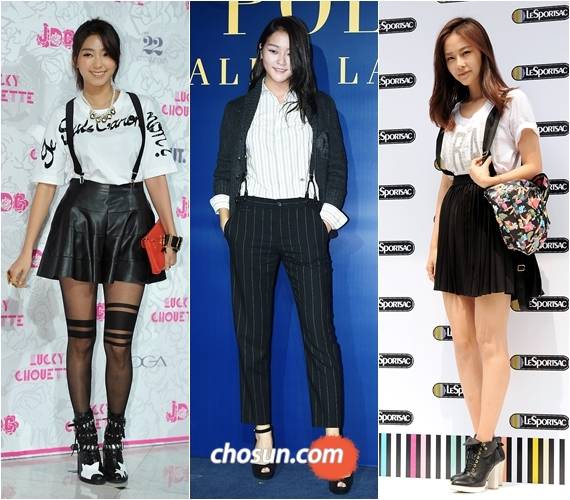 ‘씨스타’ 보라와 강승현은 각각 스커트와 팬츠에 서스펜더를 달아 위트 있는 룩을 보여줬다. 더불어 홍수현은 스커트에 멜빵을 붙인 서스펜더 스커트로 감각적인 캐주얼룩을 완성했다.
