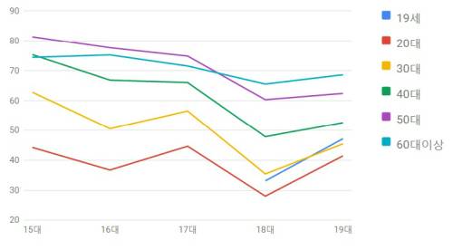이같은 결과는 2030세대가 우리나라 정치 지형에 있어 별다른 파워를 갖추지 못했다는 근거일 수 있다. 전체 유권자 가운데 차지하는 비중도 낮을 뿐더러 기성세대에 비해 '한표'를 행사하는 젊은세대는 더 적기 때문이다. 정치권이 2030세대를 향한 '립서비스' 외에 별다른 공약을 내놓지 않는 이유다.