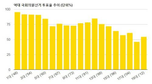 우리나라 총선 투표율은 일정한 흐름이 보이지 않는다. 15대 총선(1996년) 때 63.6%였던 투표율은 16대 57.2%, 17대 60.6%, 18대 46.3%(최종)까지 떨어지더니 19대 때는 54.4%로 반등했다.인구학적 변화나 전반적인 정치적 관심도와는 별개일 수 있는 것이다.