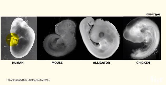 모든 척추동물의 태아 신체구조는 착상 4주 동안 똑같이 진행됩니다. 따라서 이 기간 동안 인간 배아는 꼬리가 있는 다른 척추동물과 같은 형태를 띱니다.
