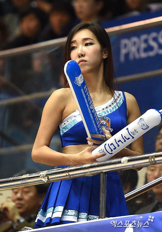 [엑스포츠뉴스=구리 권태완 기자] 9일 오후 경기도 구리시 구리실내체육관에서 열린 '2015-2016 KDB생명 여자프로농구' 구리 KDB생명 위너스와 춘천 우리은행 한새의 경기에 치어리더 강산하가 응원을 하고 있다.