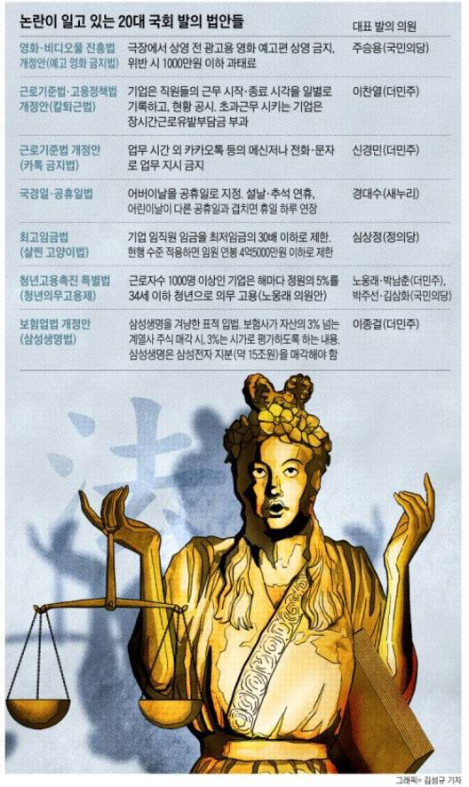 20대 국회가 지난 한 달간 발의한 법안 500여 건 중 일부 내용이다. 최근 국회가 법으로 규제하기에 부적절한 내용을 담은 법안을 잇따라 발의하고 있다. 특정 기업·집단에 타격을 주기 위해 만든 ‘표적 입법’도 많다. 과거엔 소수 의견으로 여겨졌던 다소 황당한 법안들도 여소야대의 20대 국회에선 통과 가능성이 높아 관련 업계와 단체들은 바짝 긴장하고 있다. 성태윤 연세대 경제학과 교수는 “있던 규제를 없애도 모자랄 판국인데, 최근 발의안들을 보면 의원 입법이 오히려 ‘장애물 없는 규제 기관차’가 될 수도 있겠다는 생각이 든다”고 말했다.