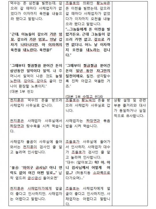 최 작가는 “‘조들호’는 ‘값싼 수임료에 최선을 다해 일하는 동네변호사가 된다’라고 쓰고, ‘천원짜리 변호사’는 ‘값싼 수임료에 최선을 다해 일하는 천원짜리 변호사가 된다’라고 써놓으면 누가 보더라도 같은 문장이다. 하지만 저 문장은 내 기획안에도 없고 ‘조들호’ 웹툰에도 없다. ‘조들호’ 측이 유리하도록 만들어낸 문장이다”라고 설명했다.