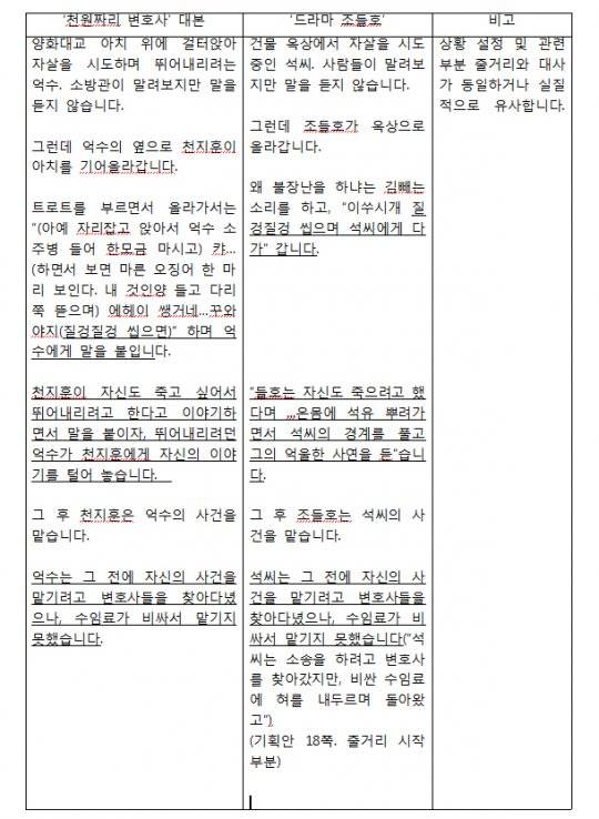 제가 드라마로 각색된 조들호의 기획안과 대본에 대해서 의혹을 제기할 때는 ‘천원짜리 변호사’와 드라마 ‘조들호’의 기획안과 대본에서 유사하거나 일치하는 문장들만을 비교했습니다.