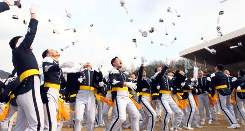 | 올해 육·해·공군, 국군간호사관학교 전형에서는 대학수학능력시험 결과에 관계없이 선발하는 우선선발 비율이 30∼100%로 늘어 수능이 약한 학생들은 노려볼 만하다. 지난달 25일 충북 청주 공군사관학교에서 열린 제64기 공군사관학교 졸업식에서 생도들이 하늘을 향해 힘껏 모자를 벗어 던지고 있는 모습. 청주=연합뉴스 |