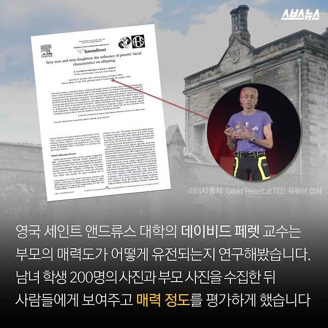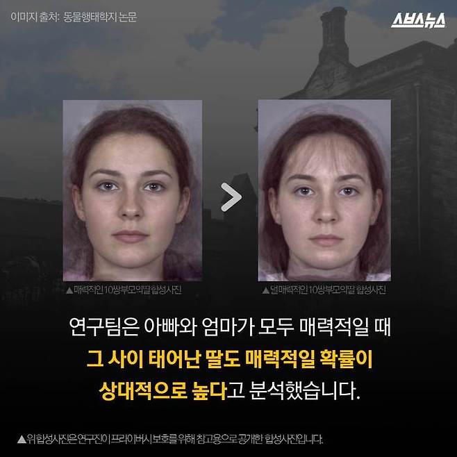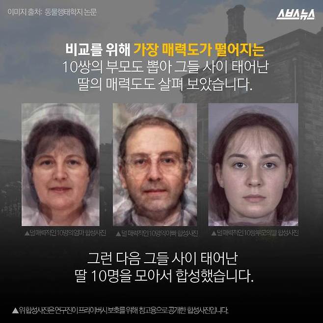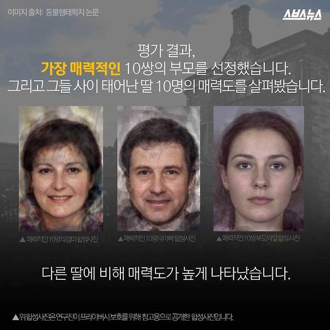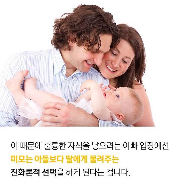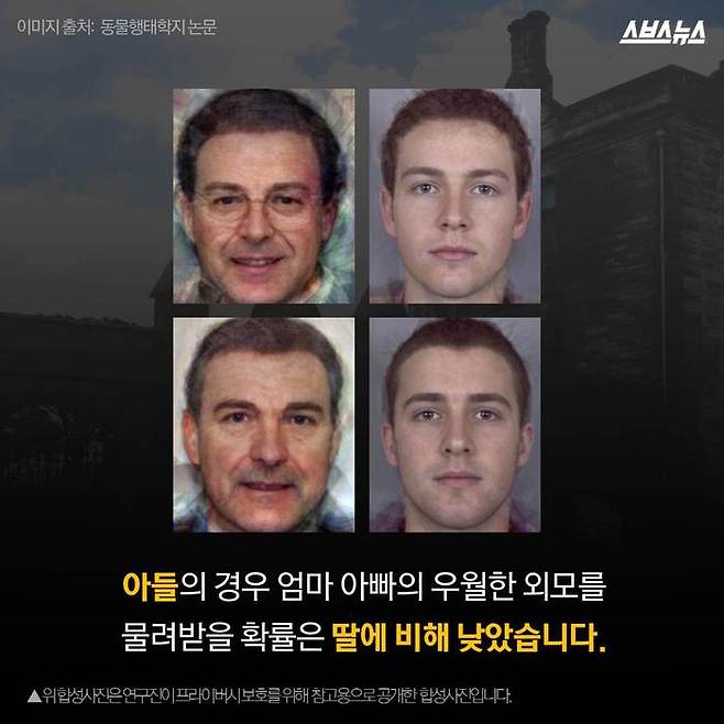 영국 세인트 앤드류스 대학의 데이비드 페렛과 엘리자베스 콘웰 교수의 연구에 따르면 딸은 부모의 우월한 외모를 물려받을 확률이 높으며, 그 중에서도 아빠의 영향이 더 큰 것으로 밝혀졌습니다.