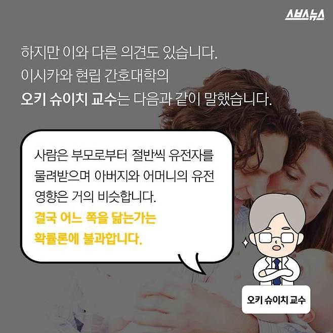 이시카와현립간호대학의 오키 슈이치 교수는 “사람은 부모로부터 절반씩 유전자를 물려받으며 아버지와 어머니의 유전 영향은 거의 비슷하다. 결국 어느 쪽을 닮는가는 확률론에 불과하다”고 밝혔습니다.