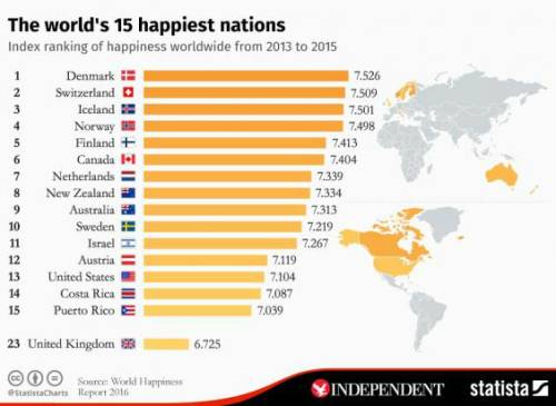 최근 유엔이 발표한 세계 각국 행복지수 순위를 보면 두 가지 흥미로운 점이 눈에 띈다. 하나는 국력이나 경제규모는 행복 수준과는 별다른 상관관계가 없다는 것이다. 유엔 행복도 조사에서 덴마크는 1위, 스위스가 2위, 아이슬란드는 3위를 차지했고 미국은 13위, 러시아 56위, 중국은 83위에 랭크됐다. 독일, 영국, 프랑스의 행복도는 각각 세계 16위, 23위, 32위였다.