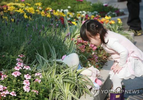 (서울=연합뉴스) 박동주 기자 = 낮 최고기온이 10∼20도를 보이는 등 봄기운이 완연한 19일 오후 대한문 앞 화단에서 한 어린이가 봄을 만끽하고 있다. 2016.3.19