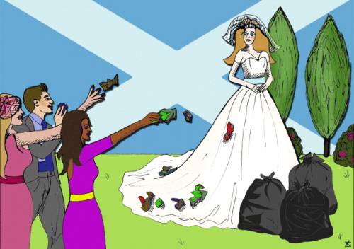 스코틀랜드에서는 ‘신부를 검게 만들기’라는 관습에 따라 여성들은 결혼하기 전에 쓰레기 세례를 받는다. 부부가 여기에서 살아남으면, 그들은 어떤 상황에서도 살아남을 수 있다고 여겨진다.