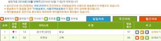 이 결과 전체 4월 가요 종합차트에서는 10센치의 '봄이좋냐?'가 1위, 케이윌의 '말해뭐해'가 2위, 버스커버스커의 '벚꽃엔딩' 3위에 이어 윤수현의 '꽃길'이 4위에 올랐다. 이어 로이킴의 '봄봄봄', 거미의 'You are my everything', 마마무의 '넌is뭔들' 이 이어 순위를 장식했다.