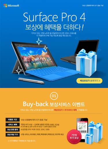 11일 한국 MS에 따르면 이번 달 11일부터 오는 3월 말까지 보유하고 있는 애플 맥북과 맥북에어, 맥북프로, 아이맥 등 중고 애플 노트북이나 아이패드, 구형 서피스를 반납하면 보상판매 프로모션이 적용된다. 중고 맥북 및 서피스는 보상금액에 7만원, 아이패드는 5만원의 추가 보상 혜택이 주어진다. 아울러 3만원 상당의 문화상품권 혹은 백화점 상품권도 함께 제공된다.