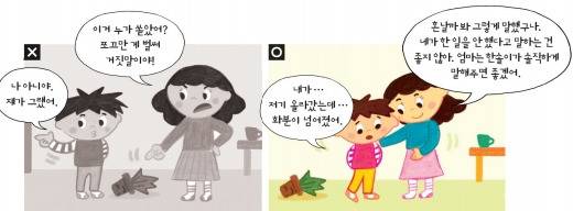 훈육 포인트 거짓말에 당황하지 말고 아이의 마음을 이해해주면서 부모가 ‘정직함, 솔직함’을 중요하게 생각한다는 사실을 알려주자. 이런 일이 생길 때마다 일관된 태도를 보여 아이가 자연스럽게 배워 나가도록 도와준다.