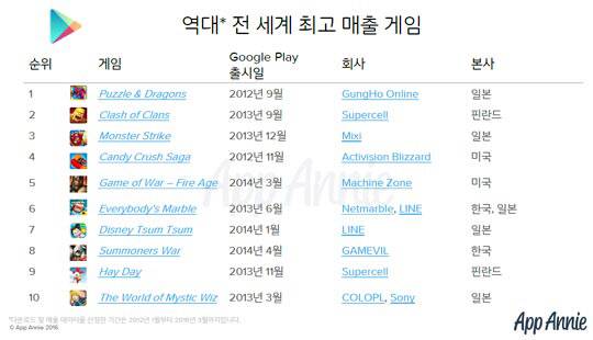 특히 일본은 구글플레이 최고 개임 및 앱 매출에서 중심적인 역할을 수행했다. 전 세계에서 가장 많은 매출을 올린 겅호온라인(GungHo Online)의 ‘퍼즐 & 드래곤(Puzzle & Dragon)’과 매출 3위 몬스터 스트라이크(Monster Strike), 7위를 기록한 디즈니 쯔무쯔무(Disney Tsum Tsum)의 매출은 거의 대부분 일본 스토어에서 발생한 매출임이 이를 설명한다.