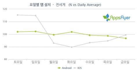 연구 결과에 따르면 전세계적으로 앱 설치가 가장 많이 일어나는 요일은 주말이며, 특히 iOS의 경우 주말에 앱 설치가 폭등했다. 지역별로 아시아에서 앱 설치가 가장 높은 시간대는 iOS가 오후 8시에서 11시, 안드로이드는 오후 12시에서 2시 및 오후 8시에서 10시인 것으로 나타났다.
