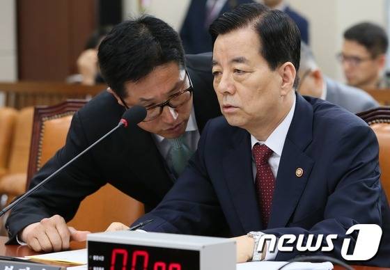 (서울=뉴스1) 송원영 기자 = 한민구 국방부장관이 3일 서울 여의도 국회에서 열린 국회 국방위원회 전체회의에서 직원과 대화를 하고 있다. 한 국방장관은 이날 현안보고에서 "북한은 40여kg의 플루토늄을 확보하고 있다고 공식적으로 확인했다"면서 "북한은 여러가지 정치적 목적 달성을 위해 핵실험을 했고, 소형화를 하고 있다고 이해하면 된다"고 설명했다. 2016.5.3/뉴스1