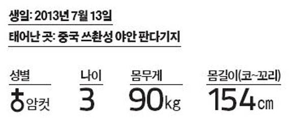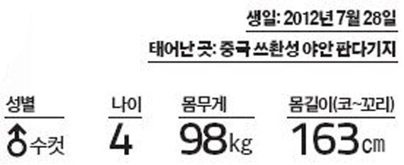 성격 온순하고 수줍음이 많습니다. 강철원 사육사에 의하면 “세심하고 조신한 성격”이라고 하네요. 움직임도 천천히 조심스러운 편입니다. 대신 호기심이 많죠. 새로운 것이 있으면 궁금해서 참지 못하는 성격이에요. 얼음바위 위에서 자는 것과 물놀이를 좋아합니다. 러바오보다 한 살이 어립니다.