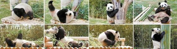 판다는 주로 나무침대에 앉아 대나무를 먹습니다. 하루 14시간 정도를 먹는데, 강철원 사육사 역시 “먹고 자고 노는 게 주요 일과”라고 설명할 정도죠. 현재 마리당 하루에 대나무 15∼20㎏을 먹죠. 고른 영양섭취를 위해 간식으로 쌀·옥수수·콩·칼슘·계란 등으로 만든 ‘빵(워터우)’과 사과, 당근을 줍니다. 가끔은 잔디밭이나 얼음바위에서 데굴데굴 구르거나 나무 타기 실력도 뽐내고요.