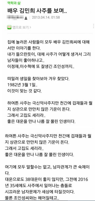 최근 온라인에서는 지난 2013년 4월 14일 자로 된 ‘배우 김민희 사주를 보며’라는 제목의 무속인 글이 화제를 모았다. “남자관계가 큰 숙제이다. 대운으로도 38대운이 좋지 않지만, 그전에 2016년 35세에도 사주에서 일어나는 충돌로 시끄러운 남자문제가 세상에 터질 것이다. 물론 조인성 씨와는 헤어질 테고”라며 “그저 총각을 만나 사랑하면 누가 뭐라 하겠나. 참, 조심해야 하는 데 걱정이네.”라는 내용이었다. 현재 김민희의 상황에 딱 맞는 글에 네티즌들은 ‘용하다’ ‘소름 끼친다’는 반응을 보였고, 일부는 이 무속인에게 상담하겠다는 의사를 내비쳤다.