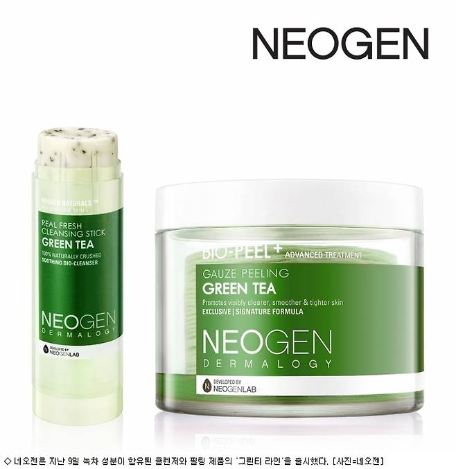 네오젠은 지난 9일 녹차 성분이 함유된 클렌저와 필링 제품의 '그린티 라인'을 출시했다. '더마로지 리얼 프레쉬 클렌징 스틱 그린티'와 '더마로지 바이오 필 거즈 필링 그린티' 2종이다.